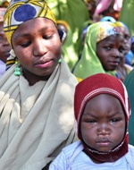 | ニジェールのマラディ近くの村で、主な家族が行っている習慣について、ユニセフが支援して行っているセッションで、息子と一緒に話しを聞くネフィサ・タシロウさん。 |