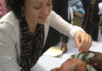 | 保健キャンペーン期間中、子どもたちにビタミンA剤を投与するユニセフ・モーリタニア事務所のルシア・エルミ代表。 |