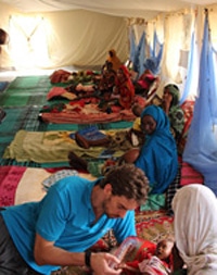 | 栄養治療センターを訪問したガソル大使。彼が寄り添っている双子のうちの一人が、栄養不良からの完全な回復を待っている。 |
