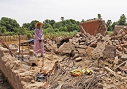 | ニジェールのサランド・ガンディ村を襲った洪水により、崩壊した家屋の中に立つアブドゥハマン・カリモウさん(62歳)。 |