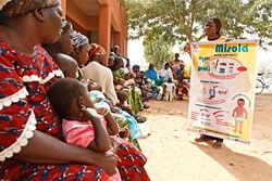 | コミュニティ保健員から、高カロリーの栄養補助食の重要性について話を聞く親子。 |