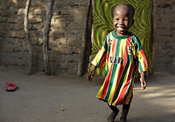 | 年上の兄弟たちと一緒に、歩いたり、走ったり遊んだりするアドゥム君(2歳)。僅か数ヵ月前まで、アドゥム君は立てないほど衰弱していました。彼は、サヘルの栄養危機の最中で運命の分かれ目に立たされた何百万人の子どもの一人なのです。 |