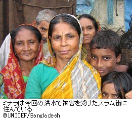 ミナラは、家から遠い地域でメイドとして働いています。洪水の間は、腰まで水に浸かりながら、1時間以上かけて仕事に行きました。それでも彼女の収入は、月々5ドルに過ぎません。ミナラには、3人の娘と2人の息子がいて、みな学校に通っていました。しかしこの洪水で地域の学校は閉鎖されるか避難所になりました。洪水で押し流された学校は74校、およそ16,000校がなんらかダメージを受け、国中でおよそ400万人の子どもたちが学校に行けなくなりました。