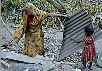 | サイクロンで崩壊した家を建て直すために屋根を拾う母親とそれを手伝う少女 |
