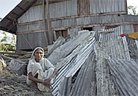 | 自分の家の残骸の横に座る60歳の未亡人、アラー・ディン。バリサル県、アムアの被災した村にて。 |