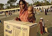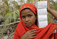 | サイクロンで大きな被害を受けたバジェハト県、南クハリ村にて。ユニセフが支援する現地のNGOプロディパンから受け取った高カロリービスケットの箱を運ぶ少女。 |