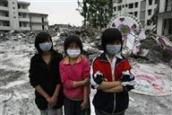 | 四川省都江堰の居延中学校では400人の子どもたちが地震で崩壊した校舎の下敷きとなり命を落とした。その校舎の前に立つ3人の子どもたち。 |