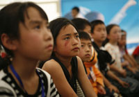 | 四川省綿陽市の避難キャンプの人々のために設置された大きな臨時教室で授業を受ける子どもたち。この地域は最も被害の大きかった地域のひとつ。 |