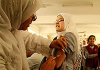 | 2週間にわたり行われた予防接種キャンペーンの一環として、サンドにある学校で、保健スタッフから、はしか、おたふく風邪、風疹の予防接種を受ける女の子。 |
