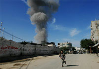 | ガザ地区での爆撃から避難する男の子。「現在のガザ危機の中では、どの子どもも家族も、避難しようにも避難できる場所がありません」と、話すアン・ベネマン ユニセフ事務局長。 |
