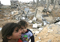 | ガザ南部、ラファ避難キャンプで、倒壊したビルの瓦礫を見つめる子どもたち。 |
