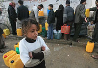 | 容器に水を入れるパレスチナ人と順番を待つ少女(ラファで)。 |