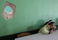 | ガザのベイトラヒヤにあるオマル・ベン・アル・カサブ学校の授業を受ける子ども。160校以上の学校がこの武力紛争の影響を受け、約54万人の子どもたちが一ヵ月以上学校に通うことができなかった。 |