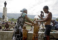 | ハイチ国立宮殿近くの噴水で身体を洗う被災者。飲料水は非常に限られている。 |