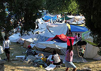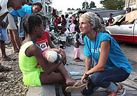 | ポルトープランスに設置された臨時避難所で暮らす子どもと話すユニセフのセシール・モドヤル子どもの保護担当官。 |