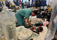 | ポルトープランスの病院で地震で負傷した子どもの様子を見る看護師。 |