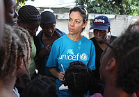 | ハイチの首相官邸で被災者の話を聞くユニセフのタマール・ハーン広報官。 |
