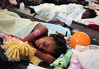 | 震災で傷を負い、空港近くの仮設病院に担ぎ込まれた女の子。家族の消息はわかっていない。 |