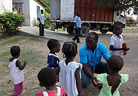 | ポルトープランスの孤児院で保護されている子どもたちと話すユニセフ・ハイチ事務所のスタッフ。この日、ユニセフは、この孤児院に飲料水720リットルを届けしました。 |