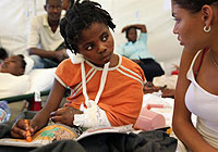 | ポルトープランスの空港近くに設置された仮設病院で、ボランティアと話すマリエーヨラインちゃん(9歳) |