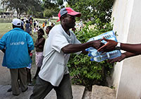 | 首都ポルトープランス近郊の町タバーの児童養護施設に、ユニセフによって提供された飲料水720リットルを運ぶスタッフ。余震を怖がっている子どもたちは、建物の外のテントで寝泊りしています。 |