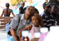 | カルフールの「英国アドベンチスト学校」の敷地に設置された仮設保健センターで、診察の順番を待つ母親と子ども。 |
