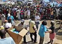 | ハイチ南部の港町ジャクメルの避難所で配布される、ユニセフの支援物資。 |