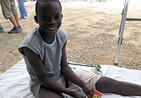| ハイチとの国境付近にあるドミニカ共和国の町ジマニにあるブエン・サマリターノ病院で、骨折した足の治療を受けているマラキくん(13歳)。怪我は回復に向かっている。 |