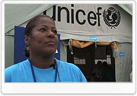 | ポルトープランス空港近くの臨時のユニセフ・ハイチ事務所本部の前に立つユニセフスタッフのロズライン・アラマン。 |