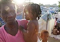 | ポルトープランスにある推定500の避難所のひとつ、ペチョンビルクラブのゴルフコースに建てられた野外の避難テントで生活する女性と子ども。 |