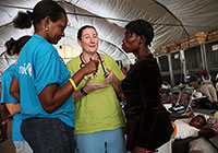 | ハイチの空港近くにある野外の病院の中にいるボランティアの医師と怪我をした子どもの母親と話しをするナディーン・ペルラウト子どもの保護担当官。 |