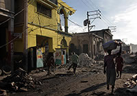 | ポルトープランスの一部崩壊した建物の前を歩く被災者たち。 |