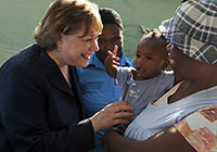 2月4日、ユニセフのアン・ベネマン事務局長は、ユニセフが他の人道支援団体とともに食糧や安全な水、基本的な保健サービスなどを提供している首都ポルトープランスの仮設避難所の状況を視察。震災以前から不安定な状態にあったハイチの社会インフラが、この震災によって大きな被害を受けたため、支援活動が困難を伴うものになっていることを指摘しました。しかし同時に、ユニセフの支援活動について、「支援を最も必要としている人々、特に女性と子どもたちのところに人道支援物資が届けられる様子を見ることができ、非常に心強く思います。」と述べています。