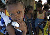 | ハイチの首都ポルトープランス近郊のリラボイスで、ユニセフが支援している孤児院で、子どもたちに配られた石けんを手に持つラモンシア・ローレントちゃん(4歳)。 |