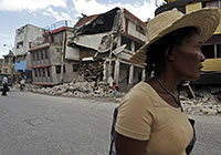 | ポルトープランス市内の震災で崩壊した建物の前を歩く女性。 |