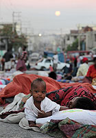 | ハイチのポルトープランスの夜明け。1月12日の震災で、外で夜を明かした赤ちゃんとその他の人々が目覚め始めました。 |