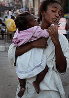 | ポルトープランスで娘を抱く被災した女性。ユニセフは、パートナーと共に被災地の乳児と幼い子どもたちの適切な食事法を促進しています。 |