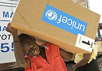 | ポルトープランスのラカイ・ドン・ボスコセンターでトラックから新たに到着したユニセフの支援物資を運ぶ男の子。 |