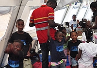 | ポルトー・プランス、サン・ピエール広場にある「子どもに優しい空間」では約120人の子どもに昼食を供給している。子ども達にとって、これが1日で唯一の食事となる時もある。 |