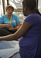 | HIVと共に生きているジーンさん(右)は、1月12日の地震発生時、妊娠5ヵ月でした。適切なケアを受けるためにユニセフのスタッフと話しています。 |