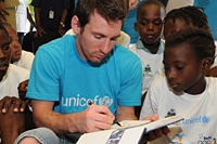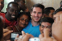 メッシ選手は、まだそれ程長いキャリアを持たないにも関わらず、サッカー選手として、既に世界の頂点に立っています. 2009年、メッシ選手はFIFA年間最優秀選手に選ばれ、ヨーロッパ年間最優秀選手(バロンドール)の栄誉にも輝いています。先週まで南アフリカで開催されていたワールドカップでは、メッシ選手はアルゼンチン代表チームの一員として、準々決勝にまで勝ち進みました。そして今、メッシ選手は、ここハイチで、全く違った役割を果たしています。有名人としての力を、世界で最も弱い立場に置かれている子どもたちを助けるために発揮しているのです。