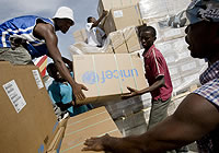 | ポルトープランスの空港に到着したユニセフの緊急医療支援物資。 |