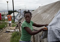 | ハリケーン「トーマス」が接近する中、テントを補強する女性(ポルトープランスの避難キャンプで)。 |