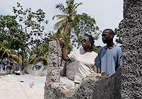 | 2010年1月の地震で倒壊した自宅前で。唯一残された外壁にたたずむ16歳のクリスチャンさんと母親のエステラさん。 |