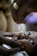 | ポルトープランスの近隣で、経口ポリオワクチンを投与される子ども。 |