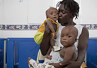 | ハイチの首都、ポルトープランスの総合病院の栄養センターで2人の子どもを抱く女性。 |