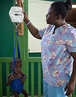 | ハイチの首都ポルトープランスにある総合病院の栄養センターで、子どもの体重を量るブルレッテ・ジーン・ルイス看護部長。 |