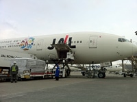 | 23日15時21分、成田空港に到着したJAL408便から降ろされるユニセフの支援物資 |
