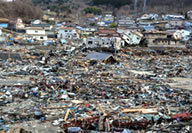 | デンマーク・コペンハーゲンにあるユニセフの物資供給センターで準備されている日本向けの支援物資。 | 被災地の様子(宮城県女川市)。 |