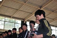 贈呈式では、野球部の主将が児童・生徒を代表して野球道具を受け取る予定となっていましたが、子どもたちの前に並べられた野球道具を見た学校の先生方の計らいで、「野球部は全員前へ!」と号令がかけられ、野球部(新2,3年生)が前に整列。制服も津波に流されてしまったため、子どもたちは私服姿でした。